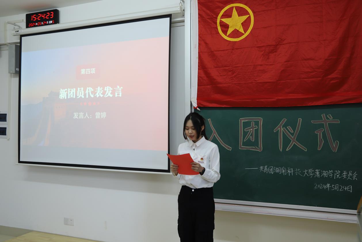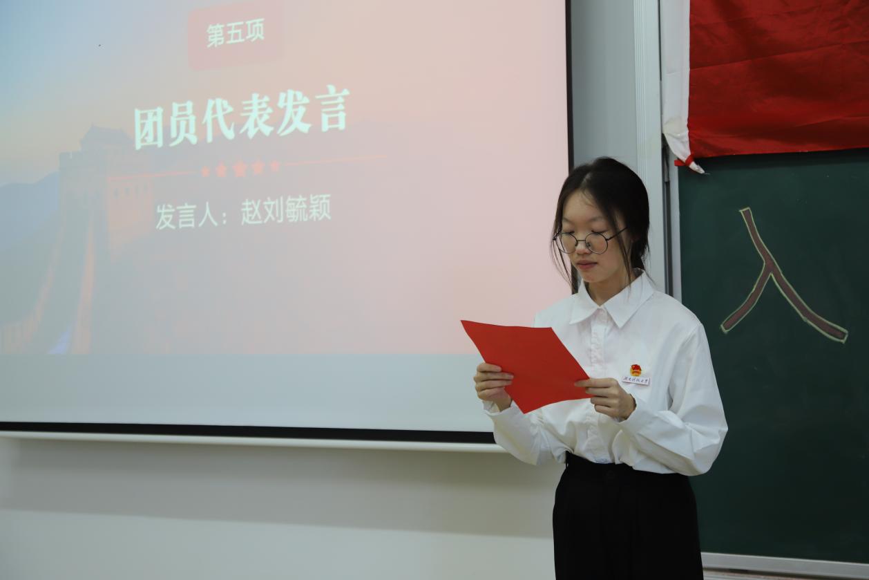22级财管专业曾婷和23级文学专业赵刘毓颖分别进行发言,曾婷强调,作为新时代青年,团员们应当时刻牢记团的宗旨,积极投身社会实践当中,为实现中华名族伟大复兴贡献青春力量。赵刘毓颖表示,能加入中国共青团倍感荣幸,也深感责任和使命重大,在未来的学习与生活中将争做担当民族复兴大任的时代新人。