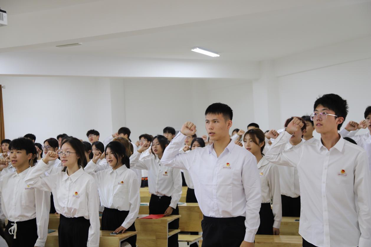 活动伊始,全体团员肃立,齐声奏唱团歌。恒博上台宣读新发展名单后,由叶军、恒博以及各学部辅导员为新发展团员授予团徽并颁发团员证,随后由团员代表曾创来带领全体新发展团员宣誓。